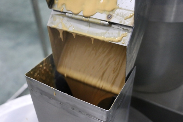威海盛泰园食品有限公司负责品质管理的于总告诉我们:“我们的花生酱不同于市面上其他花生酱,半液态的原因在于我们没有向其中加入氢化植物油,只是将烤制好的花生去皮后研磨,而且,我们所使用的花生原料是和伊藤品质烤花生果同样的原料,油脂含量高,所以会形成半液态的花生酱。同时,为了保持花生最醇正的味道,我们没有加入任何调味品。所以,可以说我们的花生酱是最自然的。”