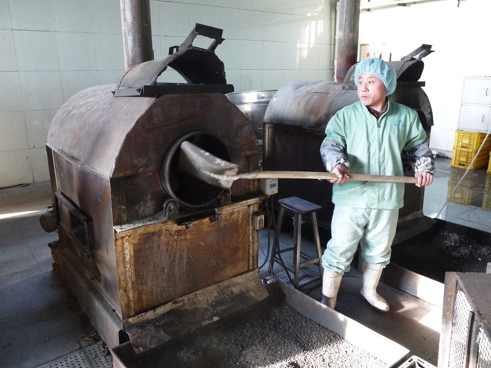 “当然烤制过程是非常重要的。为了最大限度地保留板栗本身的风味,我们使用机械,使其均匀受热进行烤制。为了突出其风味,在烤制前不将板栗开口,且烤制时就将其烤制至接近全熟。整个烤制过程持续8-10分钟,使板栗中心达到标准温度时才是烤制好了。为了易剥皮和成品率高,所以一般加工的去壳板栗都只会烤制至3成熟,再在杀菌环节使其熟透。甚至一开始在生板栗上开口再进行烤制。可是这样一来,板栗的味道就不好吃了。为了追求美味,就算会有很多不良品出现我们也要坚持长时间烤制,才能香甜可口。”“烤制好了当然就要对板栗进行去壳。为了完整取出板栗仁,我们的熟练技术人员使用特制工具,细致地去除每粒板栗的外壳。”