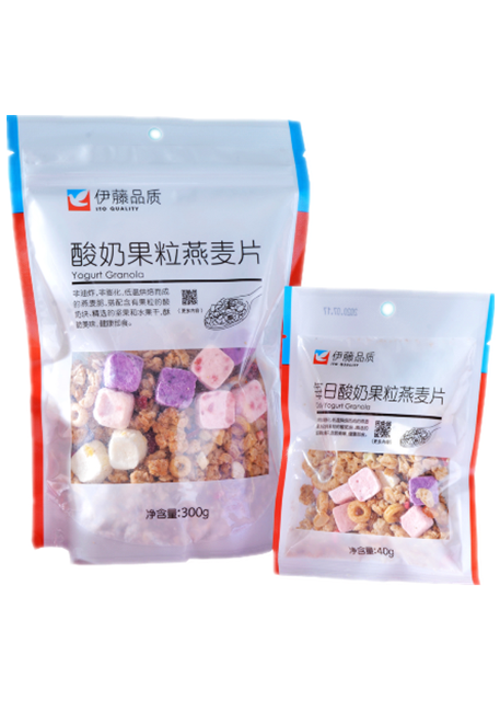 考虑到不同的食用场景,特地将这款酸奶果粒燕麦片做成两种不同的容量。40g小袋便于携带,您可以一次食用完毕;300g大袋更划算,包装袋有自封条,适合您居家或办公室常备。