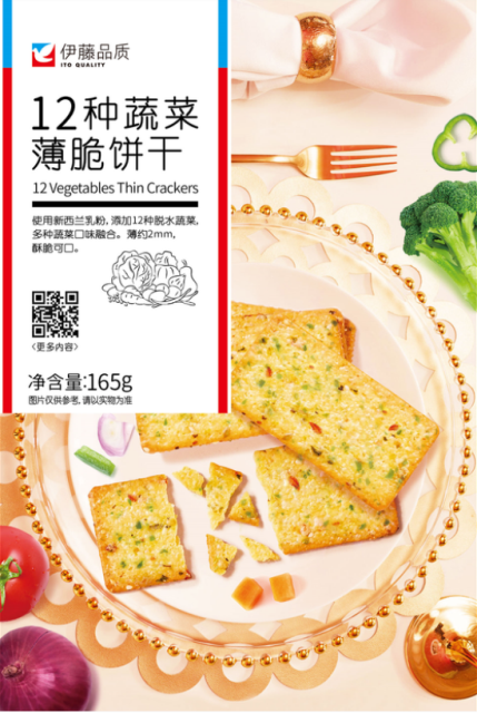 使用新西兰乳粉,添加12种脱水蔬菜,多种蔬菜口味融合。薄约2mm,酥脆可口。