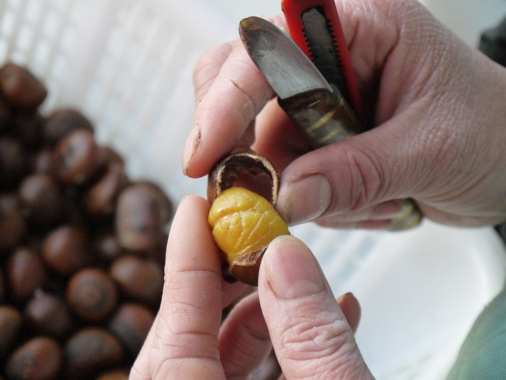 “当然烤制过程是非常重要的。为了最大限度地保留板栗本身的风味,我们使用机械,使其均匀受热进行烤制。为了突出其风味,在烤制前不将板栗开口,且烤制时就将其烤制至接近全熟。整个烤制过程持续8-10分钟,使板栗中心达到标准温度时才是烤制好了。为了易剥皮和成品率高,所以一般加工的去壳板栗都只会烤制至3成熟,再在杀菌环节使其熟透。甚至一开始在生板栗上开口再进行烤制。可是这样一来,板栗的味道就不好吃了。为了追求美味,就算会有很多不良品出现我们也要坚持长时间烤制,才能香甜可口。”“烤制好了当然就要对板栗进行去壳。为了完整取出板栗仁,我们的熟练技术人员使用特制工具,细致地去除每粒板栗的外壳。”