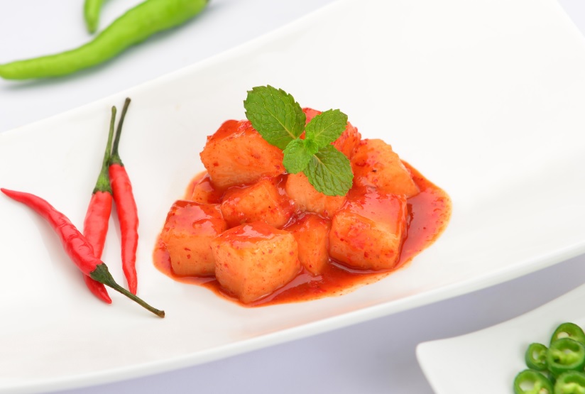 再与泡菜酱进行搅拌,低温发酵而成。泡菜酱是由源自韩国的传统配方制作而成,与嚼劲适合的萝卜相得益彰,成就美味的萝卜泡菜。
