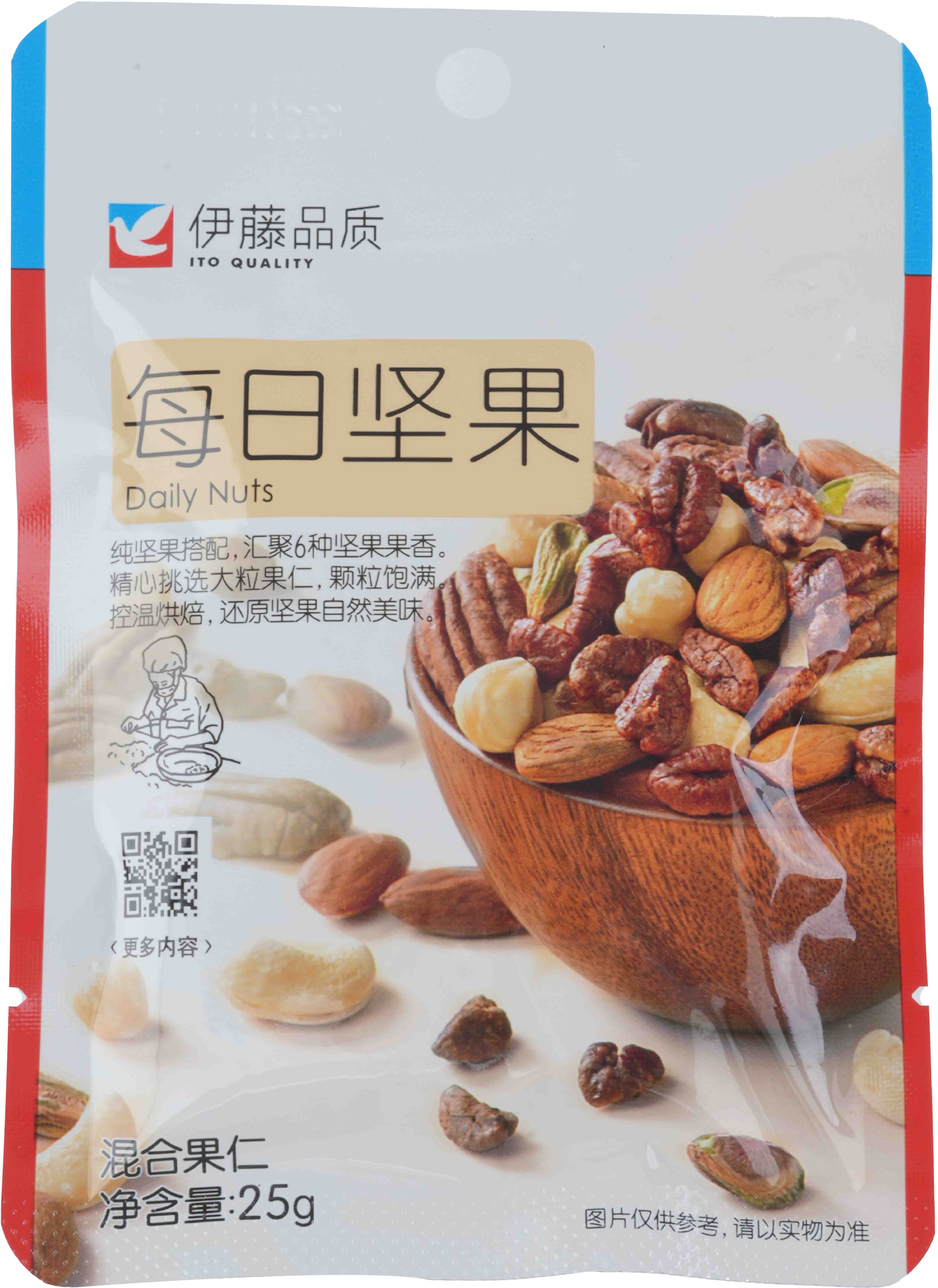这款伊藤品质每日坚果,搭配了6种优选坚果,总量25g,每天一袋,兼顾健康和美味。